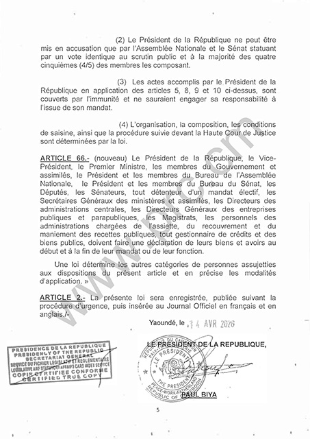 Le Président Paul Biya a promulgué le 14 avril 2026, la loi modifiant et completant certains dispositions de la Constitution du 02 juin 1972, modifiée et completée par la loi N°96/06 du 18 janvier 1996 et la loi N°2008/001 du 14 avril 2008